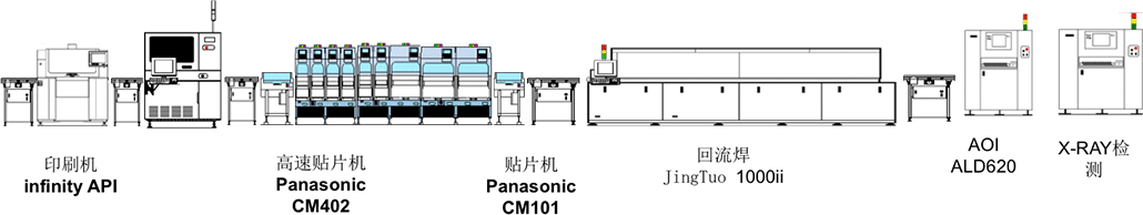 引进先进的锡膏印刷机、SMT贴片、回流焊波峰焊、在线检测以及钢网制作等设备, 并拥有X-RAY,可及时检测BGA焊接效果,配合先进的管理体系打造出"小批量,多品种, 高价值"的电子产品,有效地缩短了组装交货周期,有利保障了项目的研发生产时间;